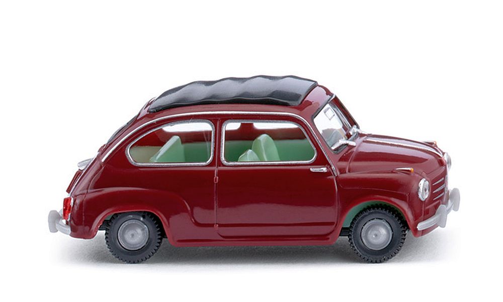 Wer hätte das gedacht, dass der knubbelige Fiat 600 einst zu den meistverkauften Pkw der Bundesrepublik gehört hat. So wurden vom Fiat 600, den WIKING in 87-facher Miniaturisierung mit weinroter Karosserielackierung und großem Filigranaufwand realisiert, immerhin über 890.000 Fahrzeuge gebaut – viele davon aus Heilbronner Produktion. WIKING lässt den Fiat 600, dessen Vorbild bis 1964 mit den hinten angeschlagenen Selbstmördertüren ausgeliefert wurde, in seiner verdienten Meilenstein-Optik selbstverständlich mit reichlichem Silberzierrat ins Programm rollen. Der kleine Erfolgsitaliener steht für die Epoche, als Fiat sich als aufstrebender Automobilist in ganz Europa einen guten Namen machte.